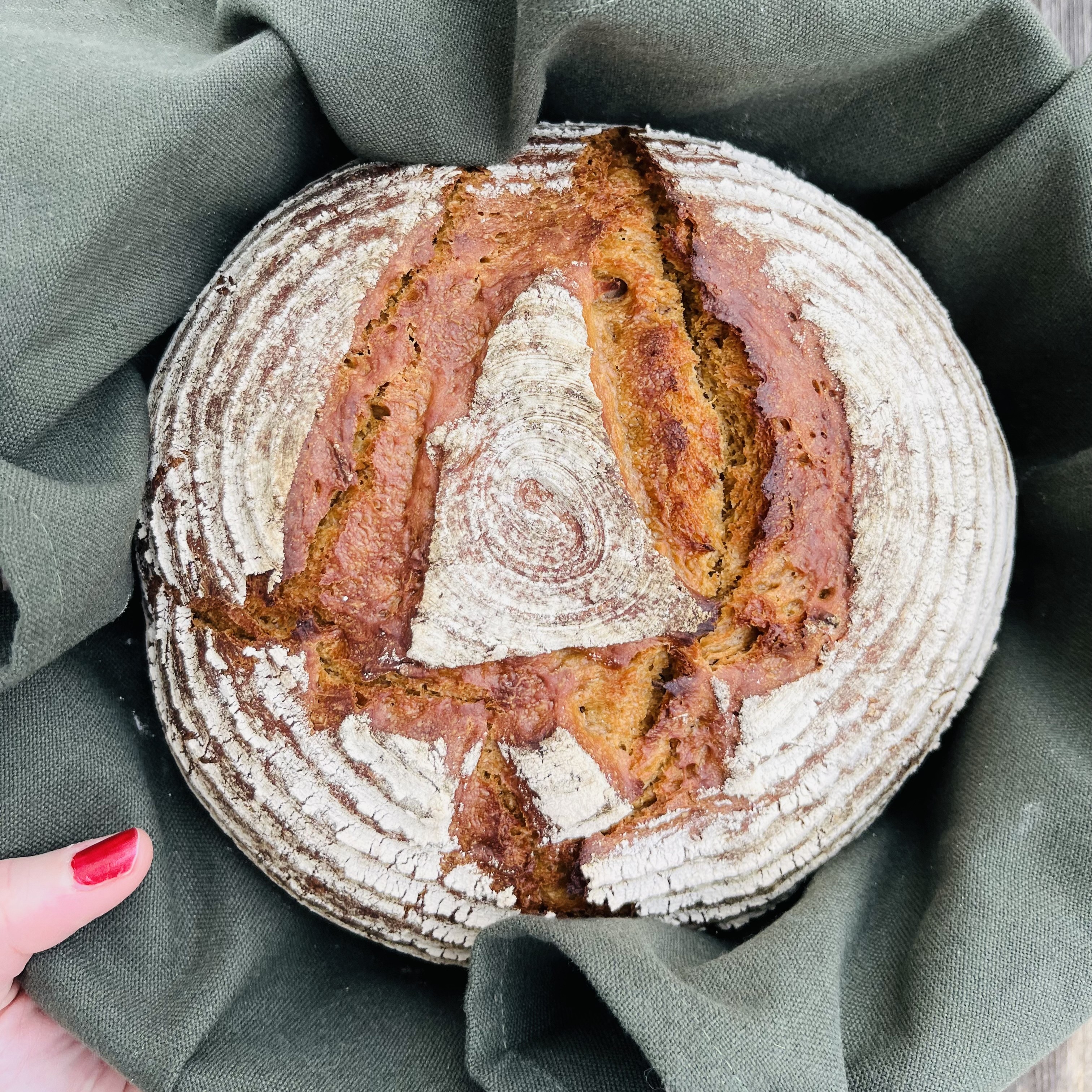 Nach der Garzeit wird der Teig auf eine mit Roggenmehl bemehlte Arbeitsfläche gegeben. Der Teig wird nun zu einem Laib geformt. Dafür werden die Teigränder von allen Seiten zur Mitte geschlagen und festgedrückt. Anschließend wird der Teig zwischen den Handflächen vorsichtig gewendet, sodass eine Kugel mit Spannung entsteht. Mit dem Schluss nach oben (unschöne Seite) wird der Teig in ein gut bemehltes Gärkörbchen gelegt. Gut abgedeckt lässt man ihn für mindestens eine Stunde rasten.