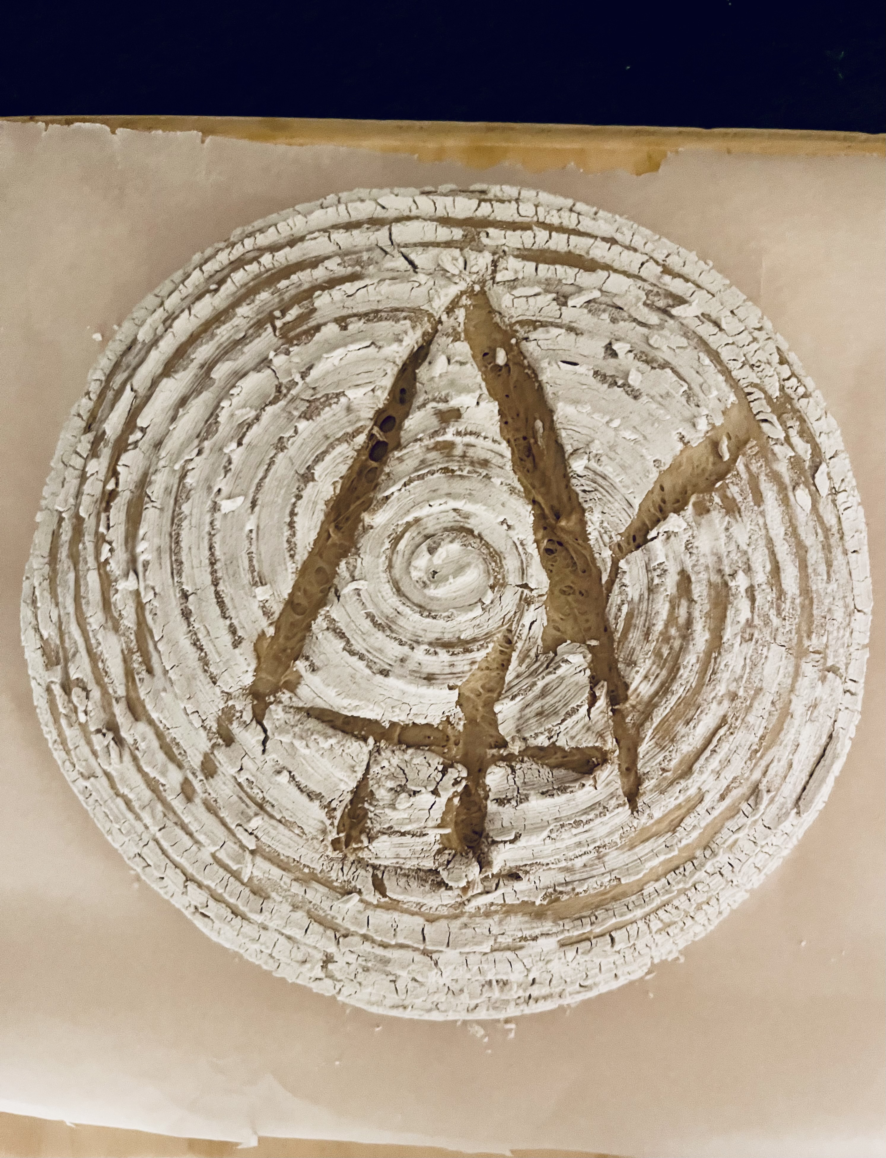 Das Brot wird nun auf eine Backschaufel mit Backpapier gestürzt. Mit Hilfe eines scharfen Messers wird ein Tannenbaum eingeschnitten. Der Laib wird mit Hilfe der Backschaufel auf das vorgeheizte Backblech geschoben und für 10 Minuten bei 240°C auf mittlerer Stufe mit viel Dampf gebacken. Sollte keine Backschaufel zur Verfügung stehen, dann wird der Laib direkt auf das kalte Backblech (mit Backpapier) gestürzt und in den Backofen geschoben.