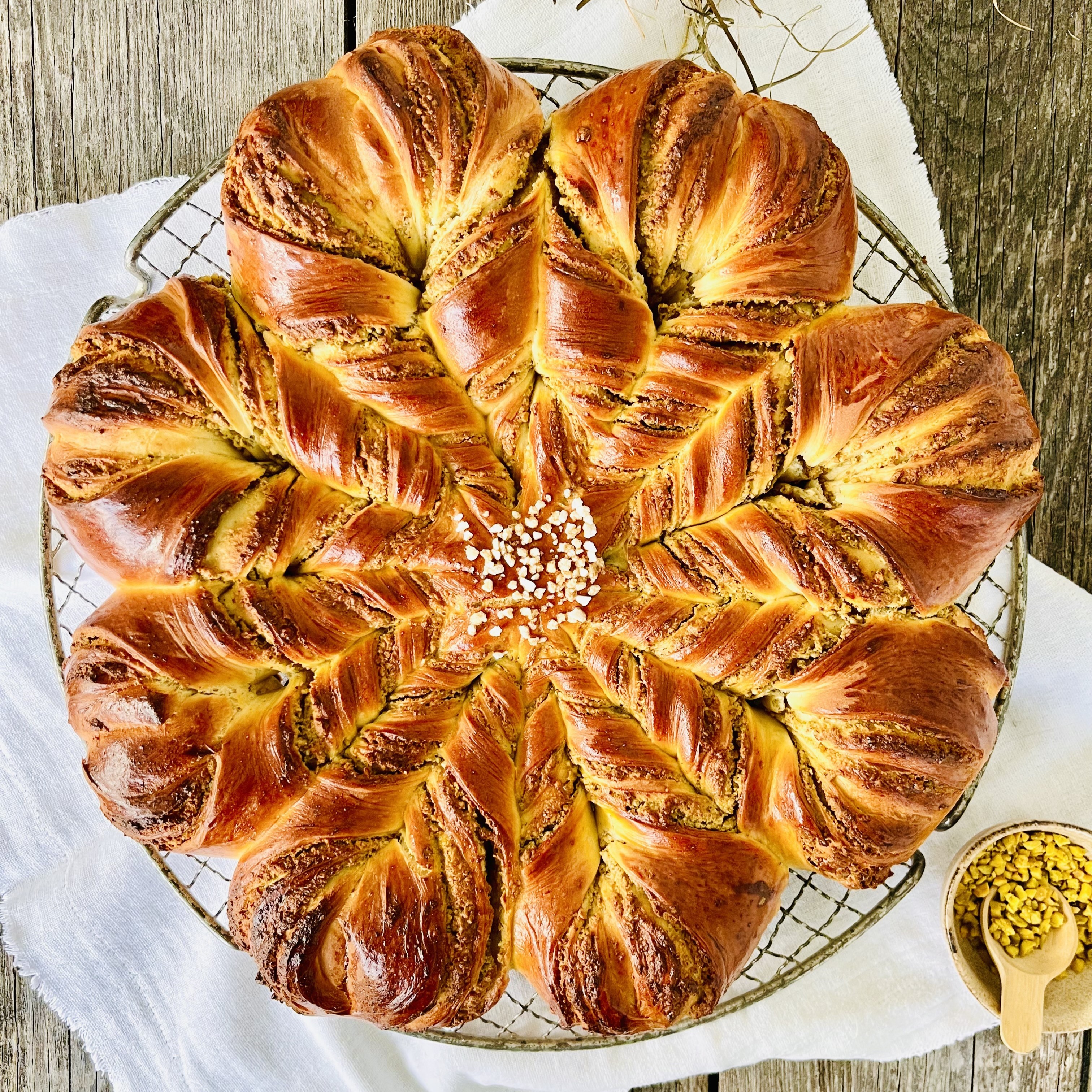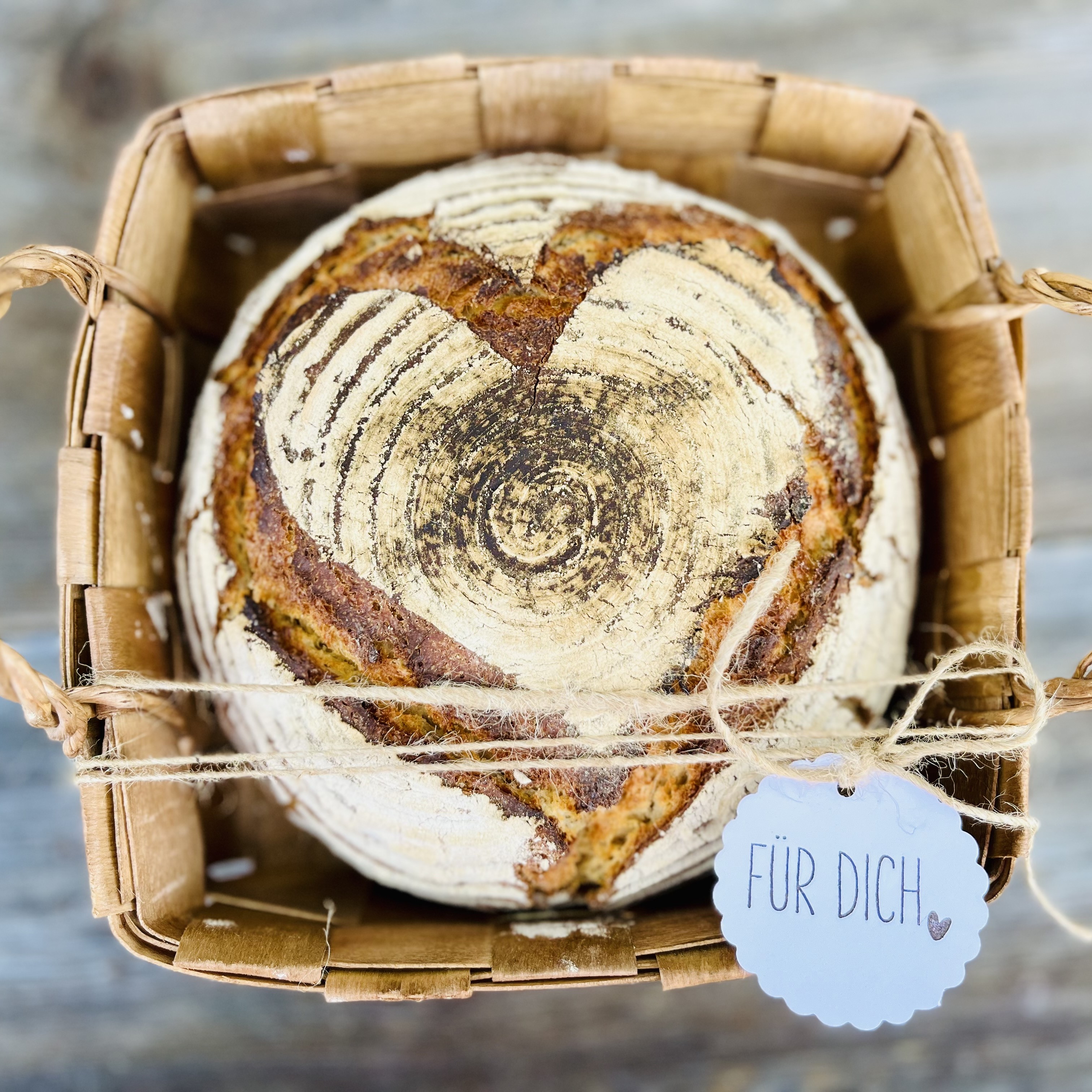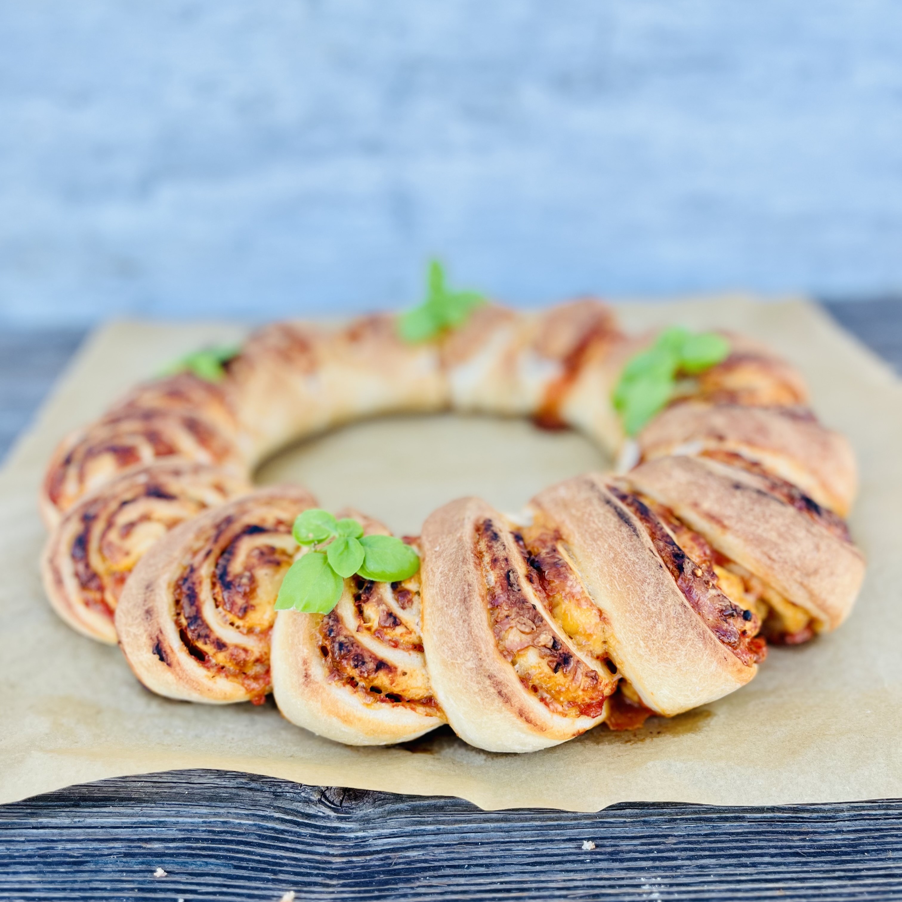 Eine runde Backform wird gut eingefettet und bemehlt (alternativ mit einem Backpapier ausgelegt). Anschließend streicht man den Teig in die Form.