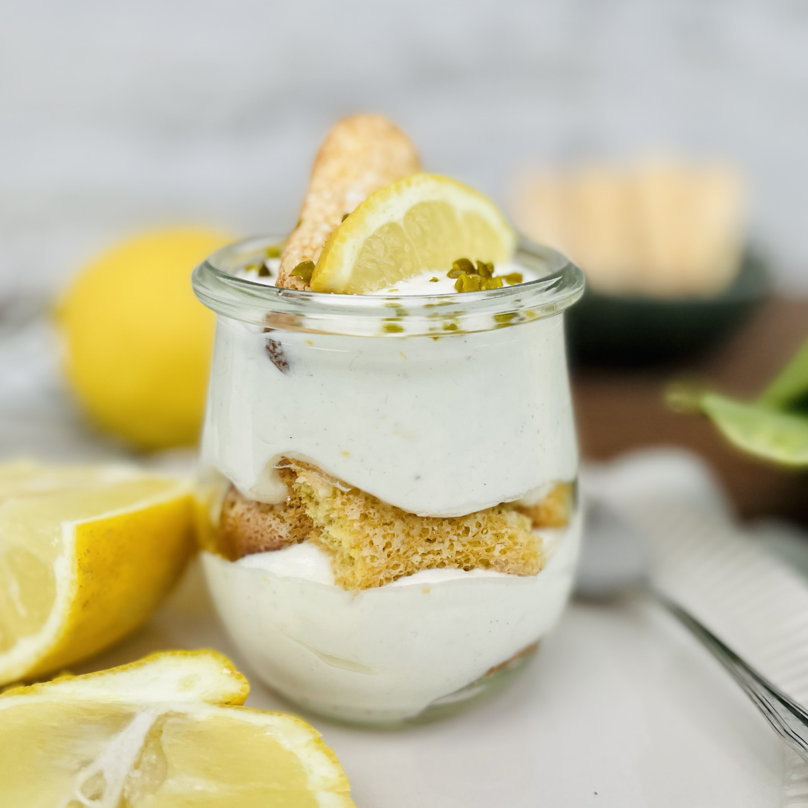 Für die Creme wird die das Naturjoghurt mit dem Zucker, dem Vanillezucker und dem Zitronensaft mit einem Handmixer cremig gerührt. Die Sahne wird steif geschlagen und unter die Joghurtmasse gehoben. Zum Schluss wird die Gelatine in einem dünnen Strahl unter die Masse gehoben. Die Creme wird auf den ausgekühlten Kuchenboden gestrichen.