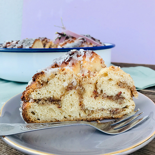 Der Kuchen wird nun für ca. 20 Minuten bei 180°C Heißluft in den Backofen geschoben und gebacken. Anschließend lässt man ihn auf einem Kuchengitter gut auskühlen.