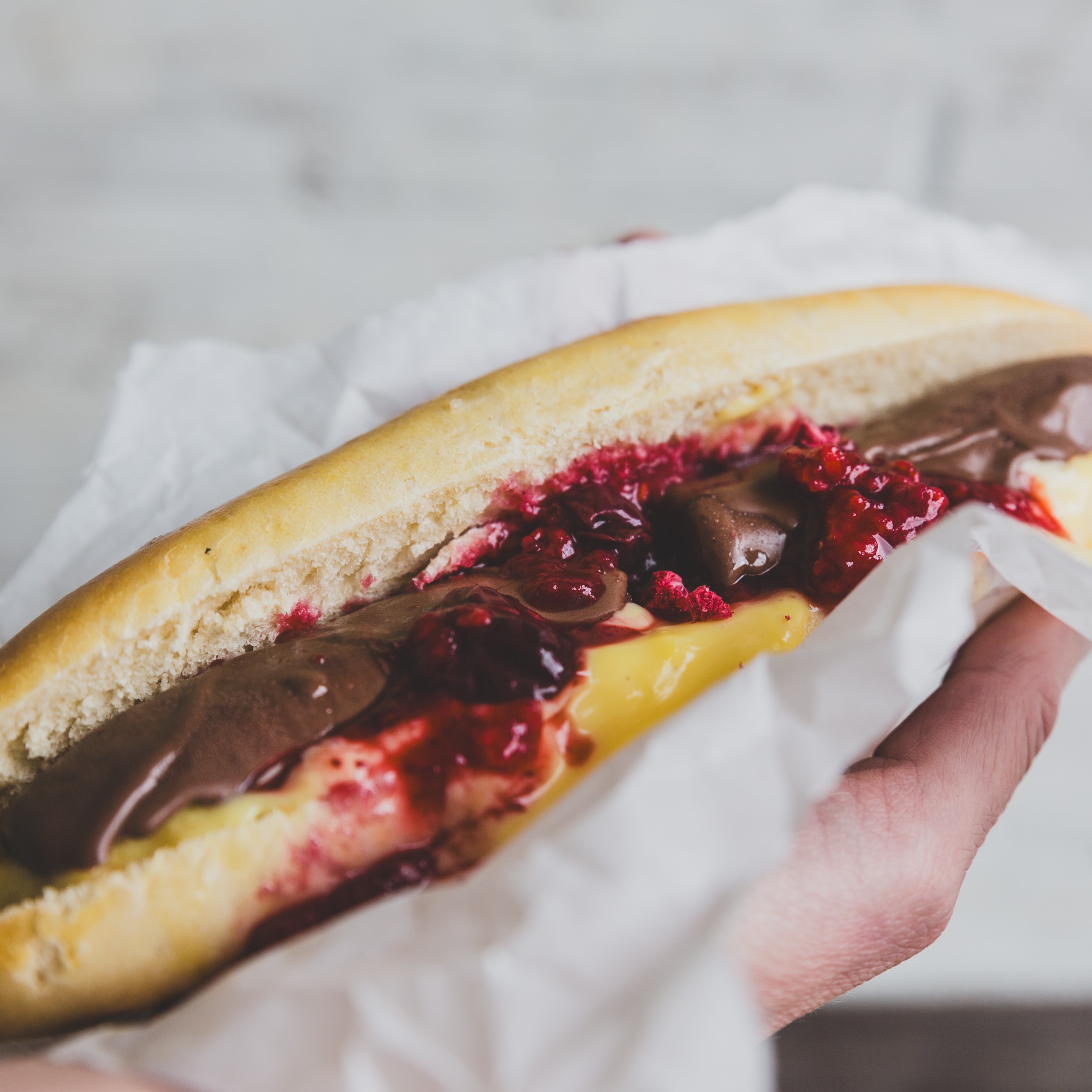 Der Kuchen wird einmal umgedreht, damit die glatte Seite oben liegt. Diese wird mit zwei Esslöffel Erdbeermarmelade bestrichen.