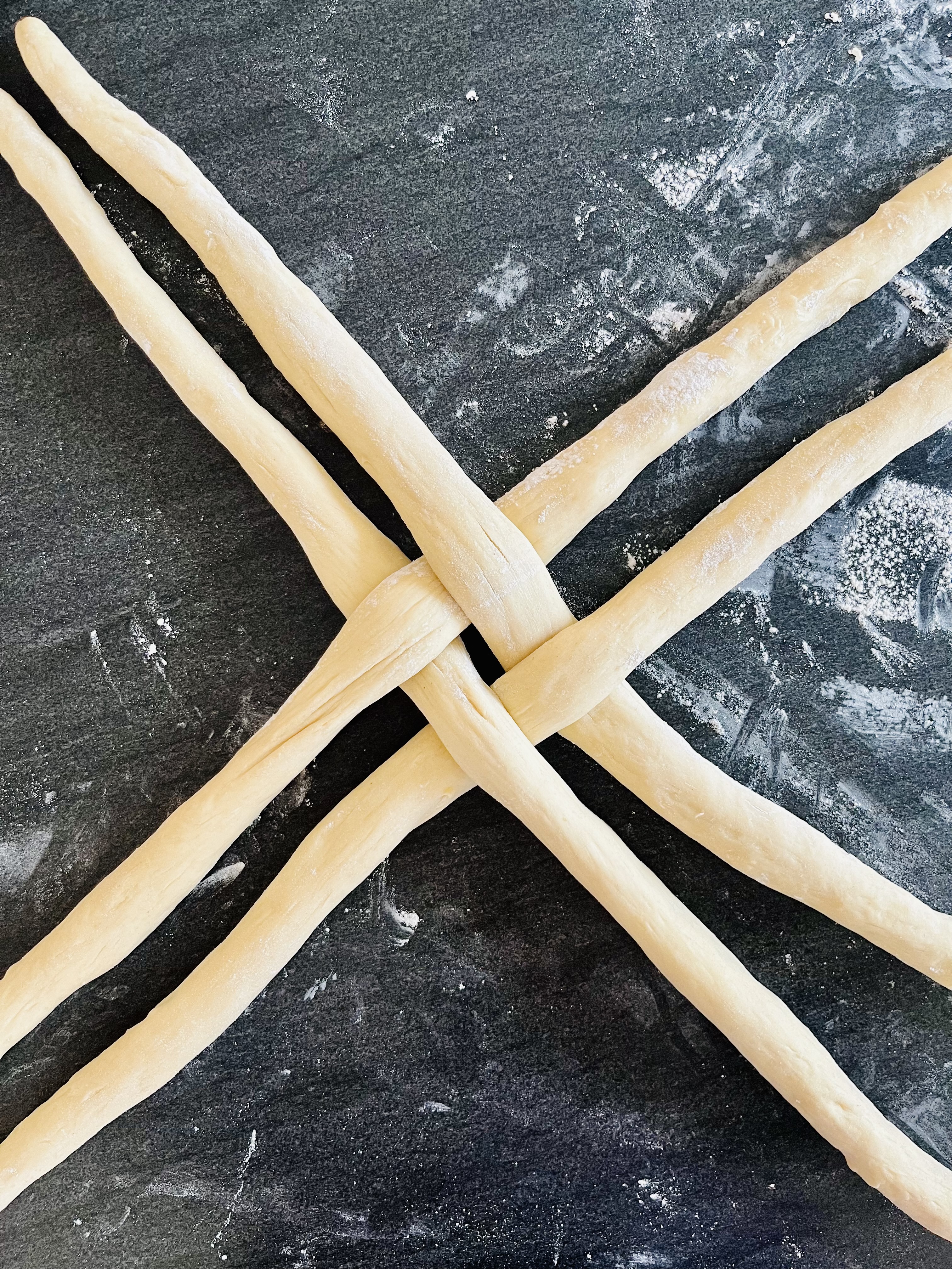 Der Teig wird auf die Arbeitsfläche gelegt. Nun werden 4 gleich schwere Stücke (ca. 250 g) abgestochen und rund geschliffen. Für einen optisch schönen Knoten ist das Abwägen sehr wichtig. Anschließend werden die Kugeln länglich geformt. Die Kugeln lässt man ca. fünf Minuten entspannen. Anschließend nimmt man eine Teigkugel und drückt sie mit den Fingern ein wenig flach. Zuerst wird die obere Seite zur Mitte eingeschlagen und festgedrückt. Den Vorgang mit der unteren Seite wiederholen. Dann die Naht mit den Fingerspitzen vorsichtig zusammendrücken. Das Teigstück wird nun von der Mitte aus länglich ohne großen Druck gerollt. Wenn ein Strang sich immer wieder zusammenrollt, lässt man ihn wieder kurz entspannen und formt ihn dann zu Ende (ca. 50 cm). Die Stränge werden nun mit Roggenmehl leicht bemehlt und zu einem Knoten verflochten.