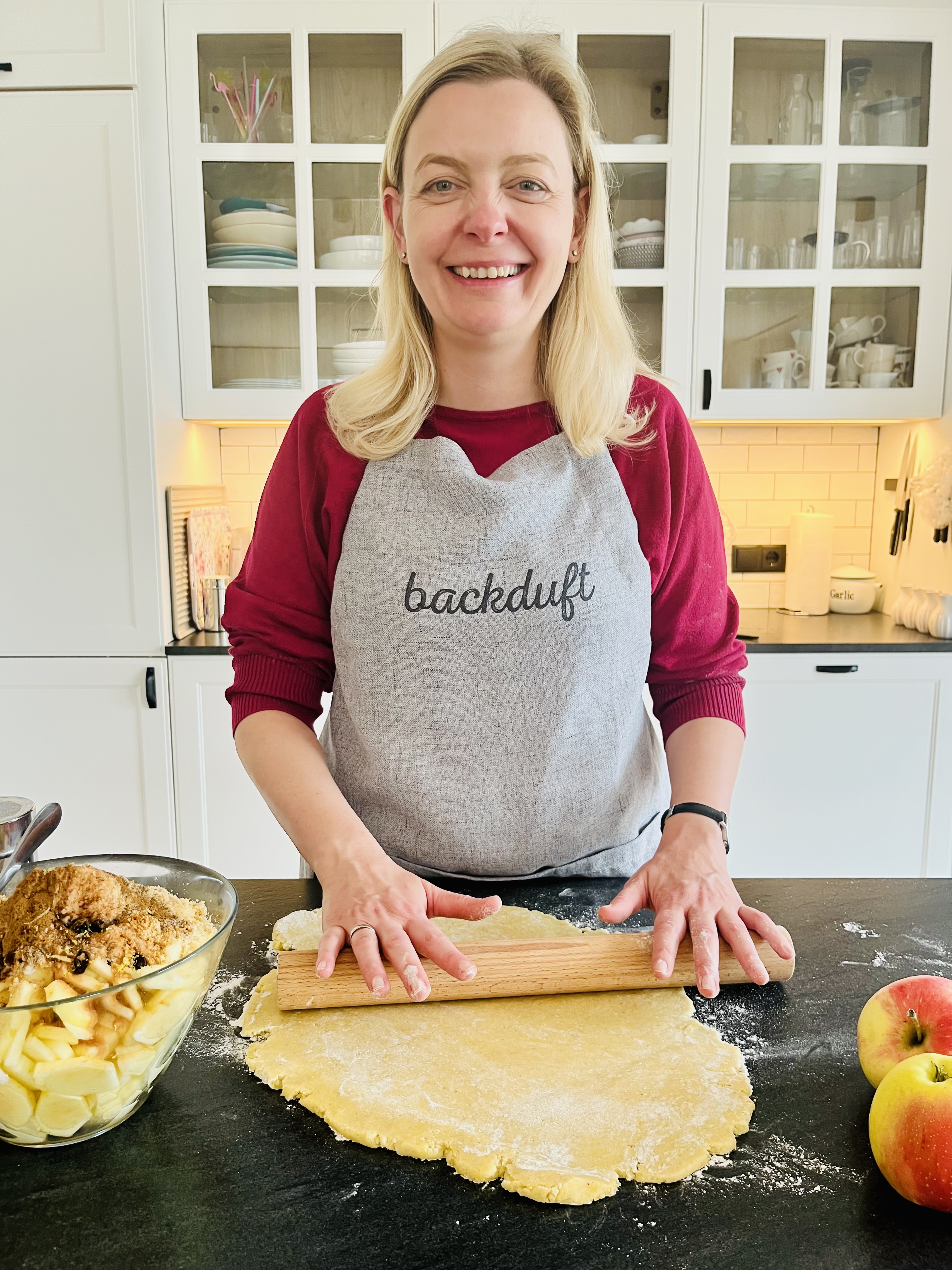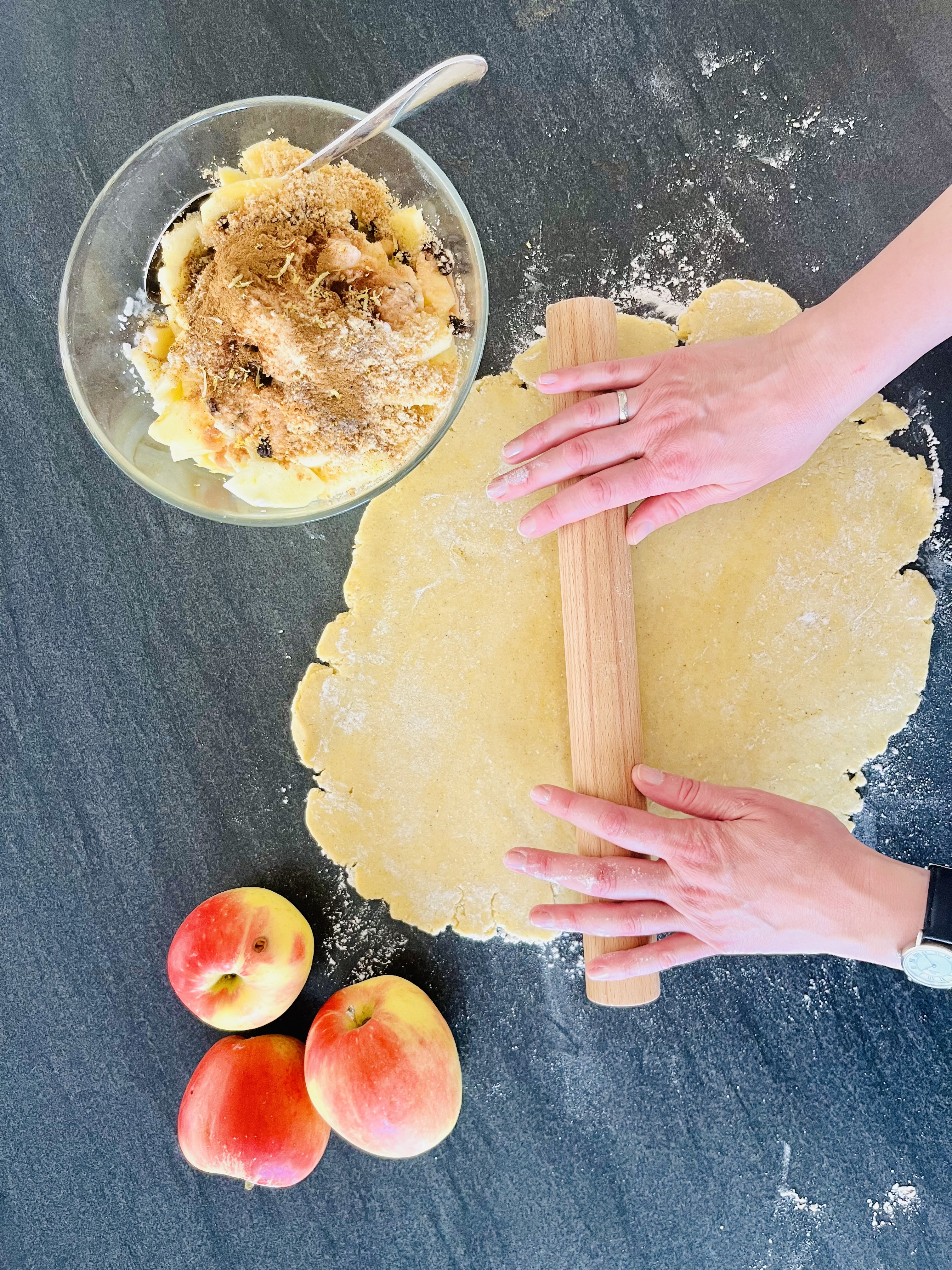 Der Teig wird auf eine bemehlte Arbeitsfläche gelegt und ca. 3 mm dick ausgerollt (30 x 40 cm). Damit der Teig nicht an der Arbeitsfläche kleben bleibt, wird zwischendurch mit einer Palette unter die Teigplatte gestrichen. Der Teig wird mit dem Nudelholz aufgerollte und auf ein mit Backpapier ausgelegtes Backblech gelegt. Anschließend wird die Apfelfülle auf dem Teig verteilt und von beiden Seiten zu einem Strudel eingeschlagen.